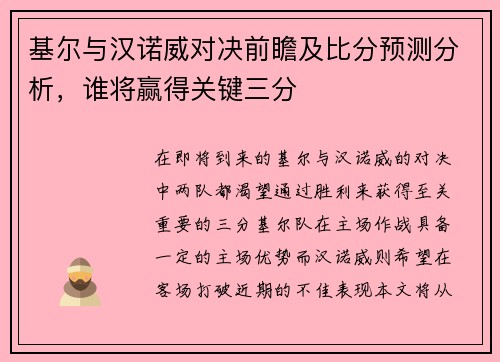 本文将对即将举行的奥厄与科隆之间的对决进行深入分析和结果预测。文章首先概述了两队在本赛季的表现、伤病情况及战术特点,并分别从历史交锋、近期状态、战术分析和比赛预测四个方面进行详细阐述。通过这些分析,读者可以更全面地了解两支球队的实力对比,为即将到来的比赛做好充分准备。最后,结合前面的分析,我们将给出一个较为合理的比赛结果预测,以期帮助球迷们把握这一场重要赛事。总体而言,这场比赛将是一场精彩纷呈的较...